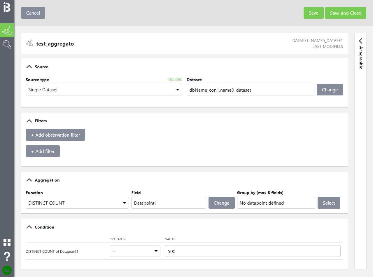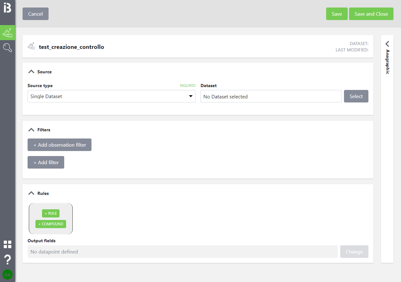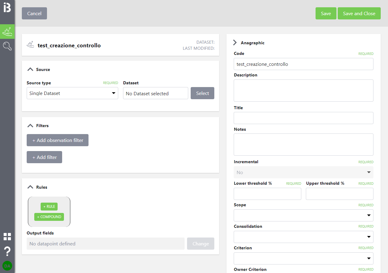 In questa vista è possibile selezionare i dataset (o join) su cui agire e creare o modificare le regole del controllo vero e proprio, con un’interfaccia differente a seconda del tipo di controllo (logico, aggregato o confronto metriche).