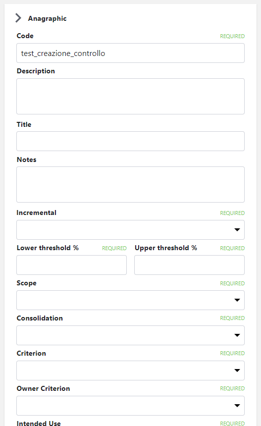 - “Scope”, “Consolidation”, “Criterion” ecc. (obbligatori) sono i parametri di classificazione del controllo. I valori possibili per ogni menu a tendina sono quelli inseriti dagli amministratori tramite l’interfaccia di amministrazione.