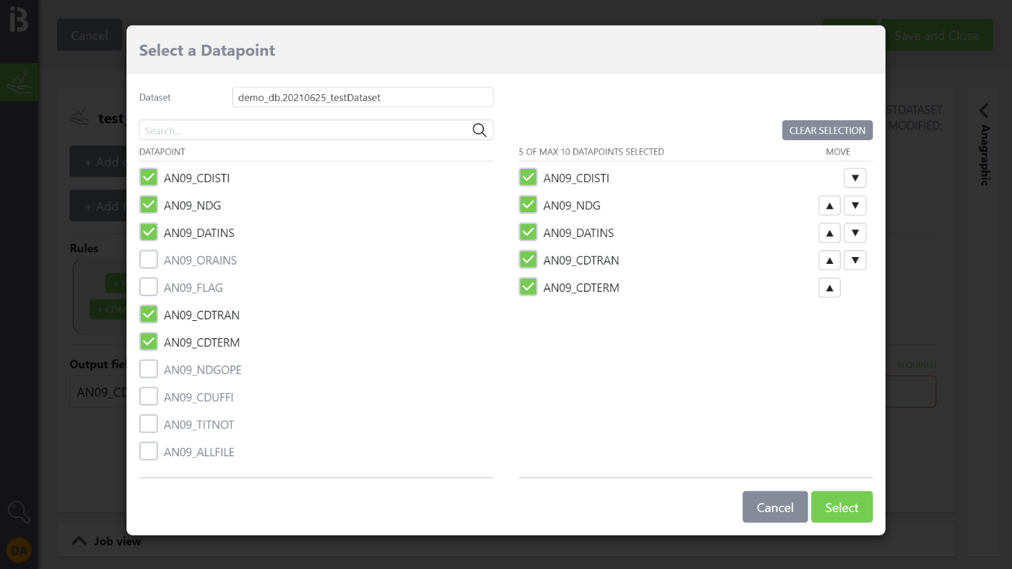 Cliccando su “Output fields” si apre la finestra per la scelta dei campi. A sinistra è presente l’elenco (filtrabile per nome) dei campi del dataset, a destra l’elenco dei campi selezionati (l’ordine è modificabile con i pulsanti freccia).