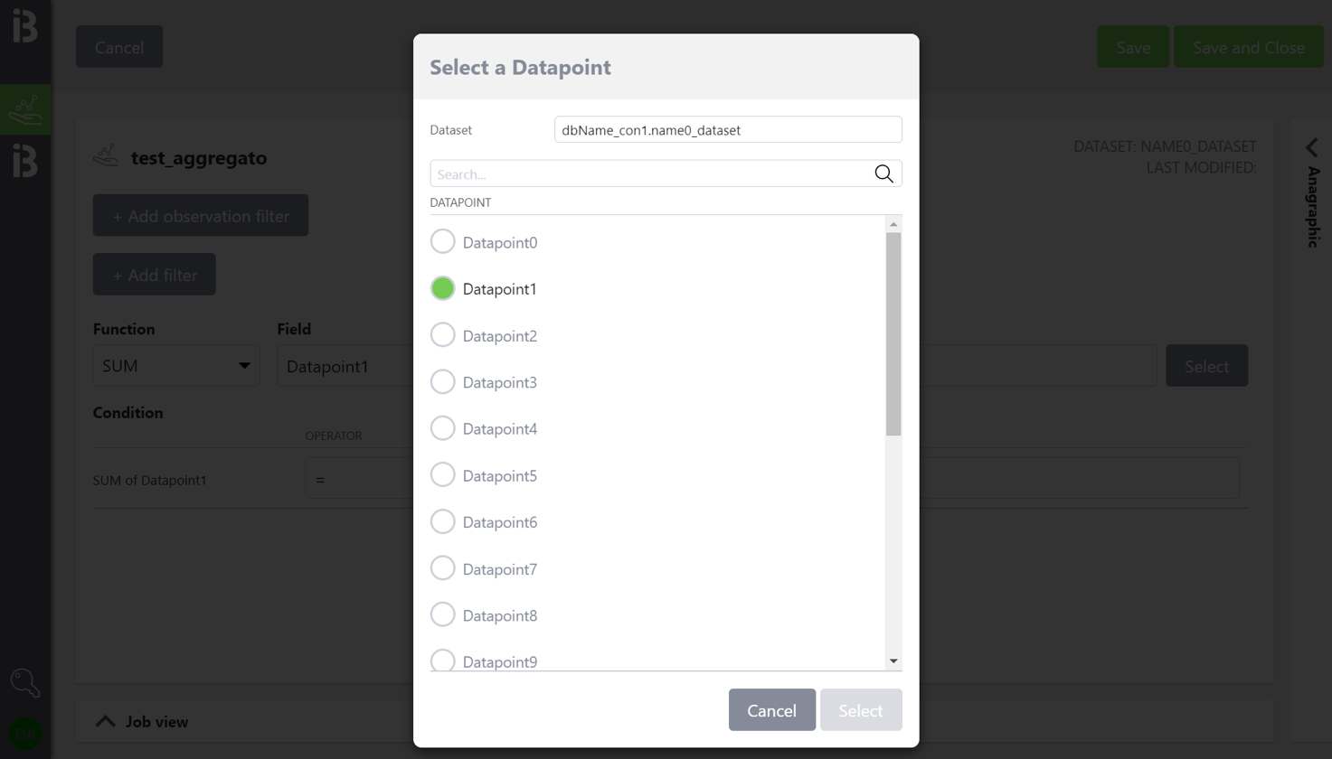 - filtro osservazioni (espressione booleana più o meno complessa che viene usata per filtrare i campi del dataset o join su cui eseguire le osservazioni)