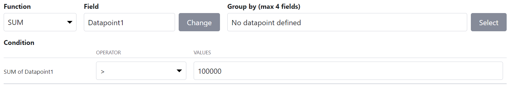 Nei controlli di tipo aggregato si sceglie una funzione di aggregazione ("COUNT", "COUNT DISTINCT", "SUM", "AVERAGE", "MIN", "MAX"), il campo su cui applicarla (tranne per la “COUNT” dove è sempre “COUNT(*)”) e opzionalmente i campi su cui effettuare la“Group by".
