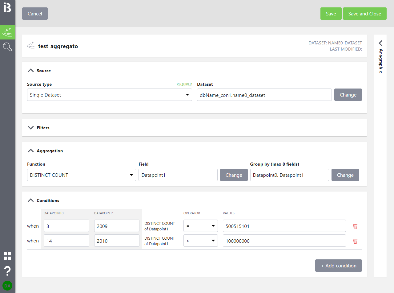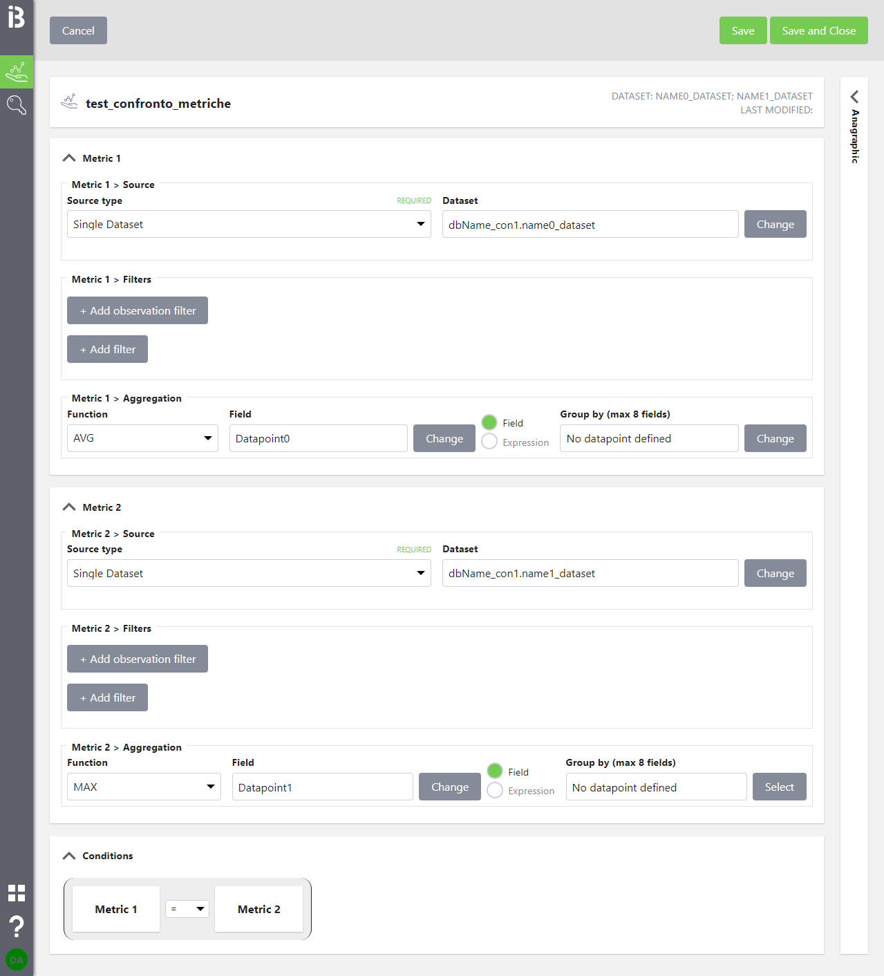 Questo tipo di controllo confronta tra loro due aggregazioni su due dataset (o join), il controllo ha esito positivo se i valori risultanti dalle aggregazioni (metriche) sono uguali o diverse (in base alla scelta dell'operatore nella sezione “Conditions”).