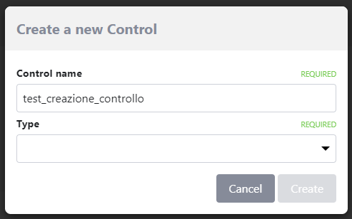 Cliccando su “Create new” nell’elenco dei controlli si apre una modale che richiede di inserire il nome del controllo e il tipo (logico, aggregato o confronto metriche). Il nome può essere modificato successivamente, il tipo una volta scelto non può essere modificato.