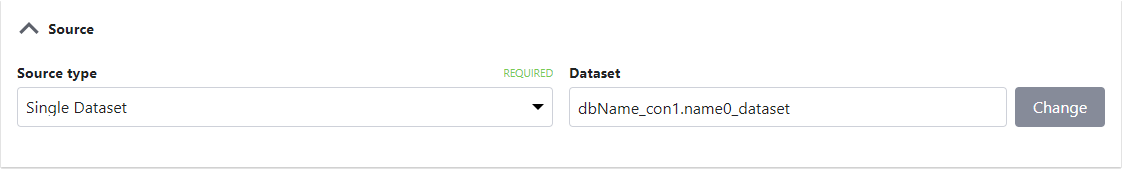 Nel caso di dataset singolo (default) è sufficiente cliccare sull'apposito campo (o sul pulsante "Select" / "Change") perché si apra una modale in cui è possibile selezionare il dataset. Nota: la scelta dei dataset è limitata alla Business Island associata al job corrente.