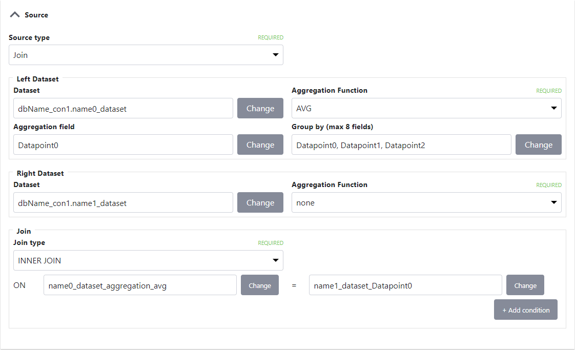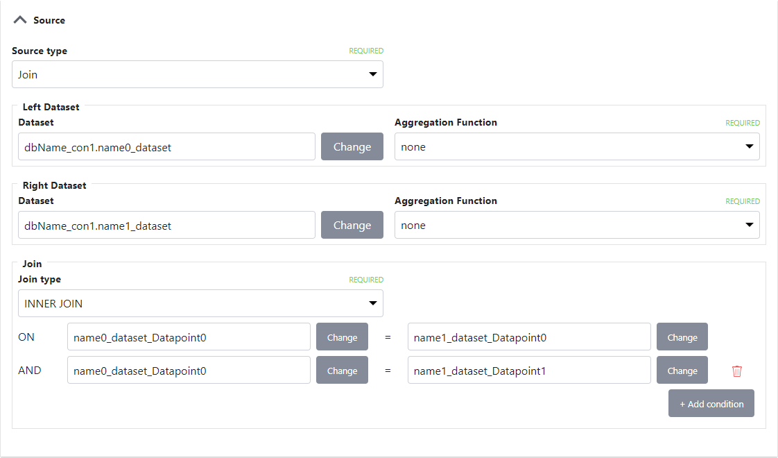 Se si seleziona l'opzione "Join" l'interfaccia cambia mostrando i due dataset da mettere in join, la scelta del tipo di join ("INNER JOIN", "LEFT JOIN", "RIGHT JOIN" ecc.) e le condizioni di join (nella forma <left datapoint> = <right datapoint>) in AND tra di loro. Deve essere inserita almeno una condizione.