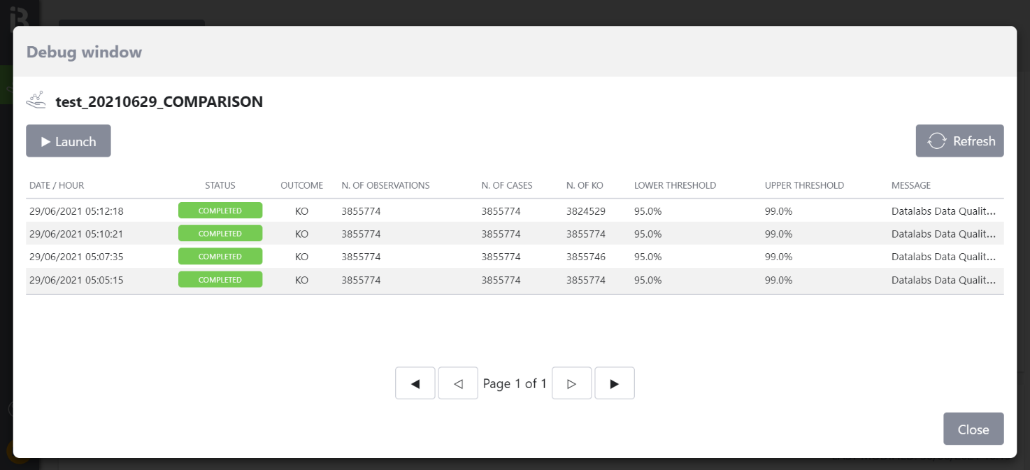Cliccando sul pulsante “Debug” di un controllo nella pagina del job si aprirà una popup che visualizza l’elenco paginato dei lanci in debug del controllo in questione e permette di effettuare un nuovo lancio in debug o aggiornare l’elenco.