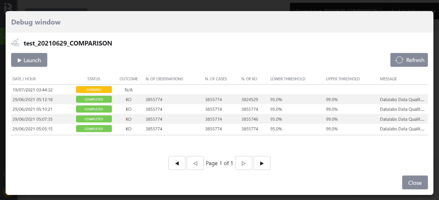 Cliccando su “Launch” si effettua un nuovo lancio in debug del controllo corrente, che viene evidenziato con una nuova riga in tabella in stato “Running” (essendo ancora in esecuzione non è possibile visualizzarne l’esito, che pertanto è “N/A”).
